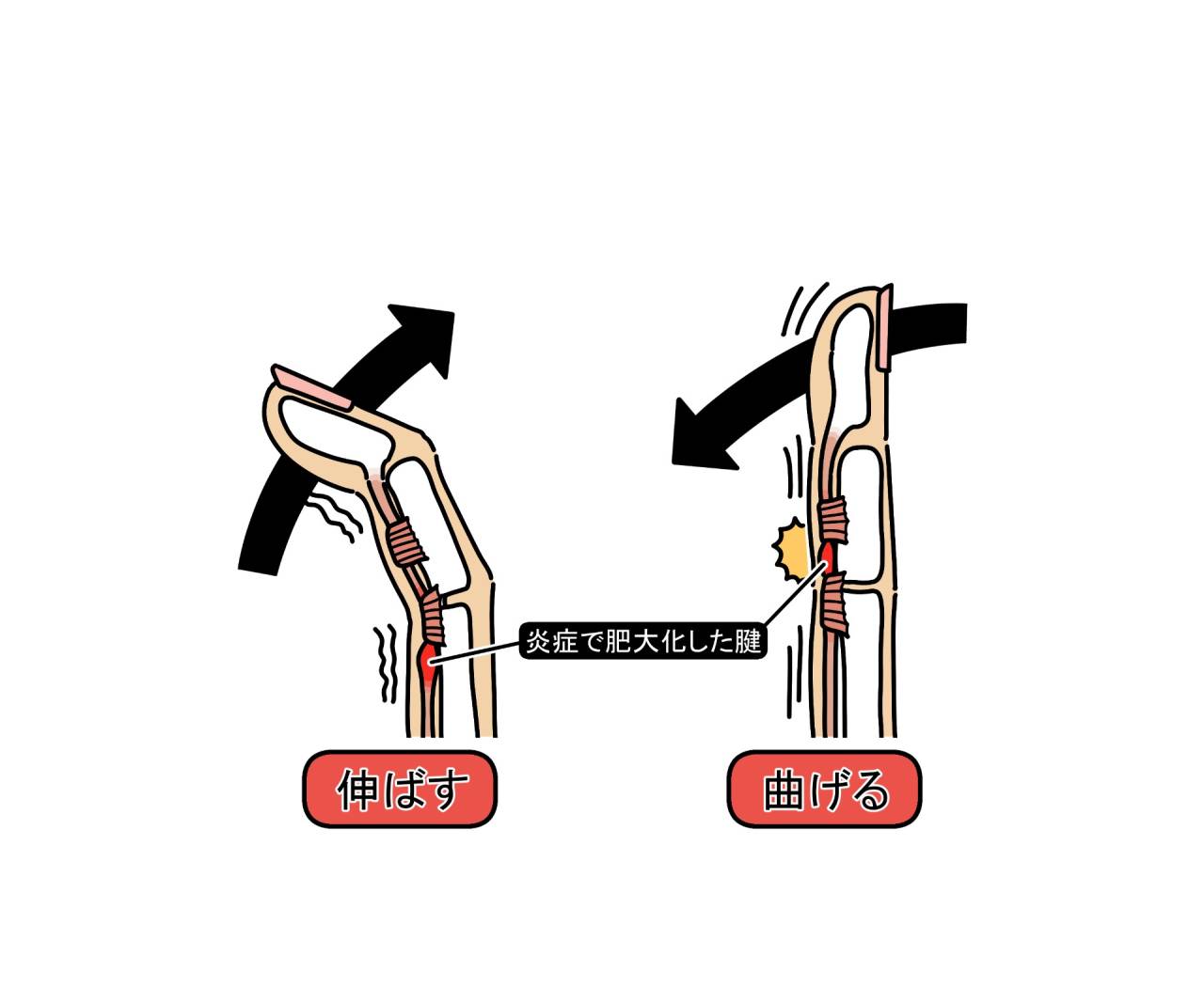 ある角度で「カクン」と跳ねるといった、ばねのような動きが現れることから「ばね指」と呼ばれています。